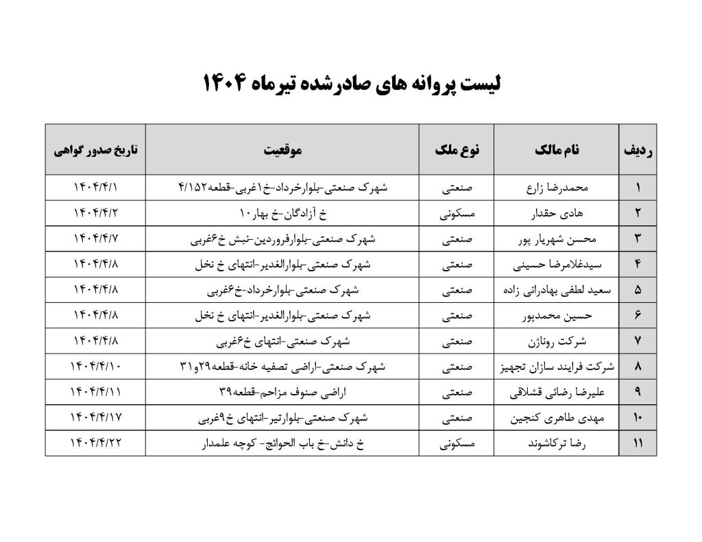 لیست پروانه های صادرشده تیرماه ۱۴۰۴